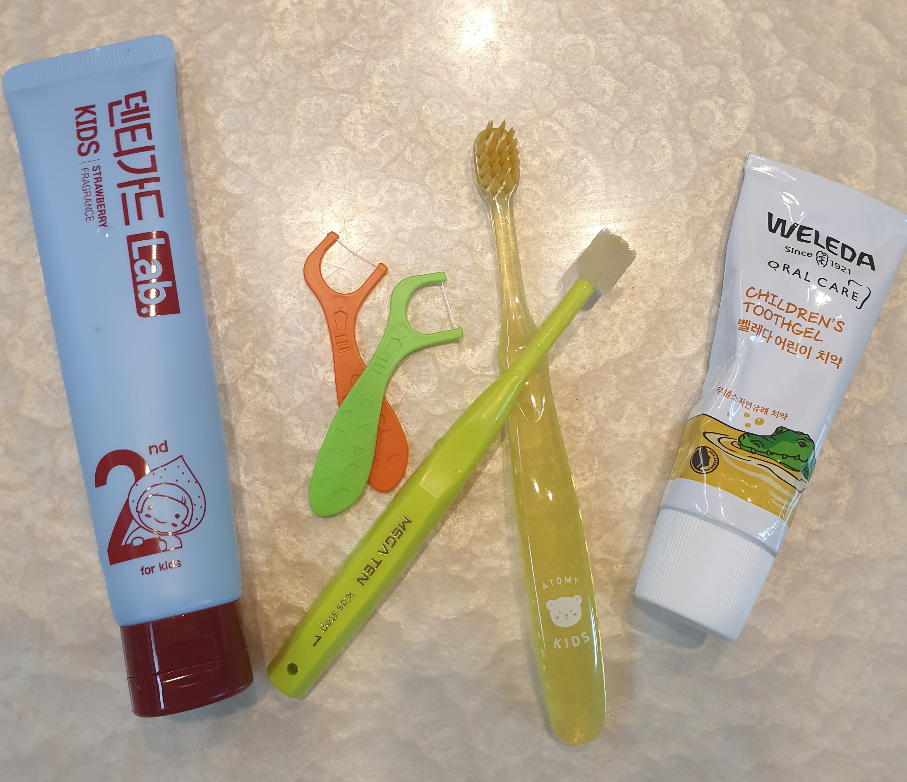 젖니나 유치는 어차피 빠질 이니까 관리를 안 해줘도 괜찮다고 생각한다면 크게 잘못 생각하고 계신 겁니다. 아기의 잇몸 속에는 앞으로 날 젖니들이 숨어있습니다. 미리 잇몸관리를 해주지 않고 방치하면 자칫 잇몸 속의 유치들이 세균에 오염되어 쉽게 썩을 수 있습니다. 유치는 영구치에 비해 유기질이 많고 치질이 약해서 굉장히 잘 썩을 수 있고 충치가 번지는 속도도 빠릅니다. 그렇기 때문에 이가 나기 전 잇몸관리부터 유치관리까지 쭉 해주는 것이 좋습니다. 수유를 하고 나서 트림을 시키고 난 후 멸균티슈나 끓였다 식힌 물을 가제손수건에 적셔 아기 잇몸 구석구석을 닦아줍니다. 혀에 있는 백태를 깨끗하게 닦아내고 싶겠지만 추천하지는 않습니다. 혀를 닦다가 아기가 토할 수도 있고 혀를 너무 깨끗하게 닦아내면 오히려 세균감염이 더 쉬워질 수 있다고 합니다. 아이 입안에 좋은 세균들도 있으니 너무 깨끗하게 하려고 하지 않아도 됩니다. 생후 6개월이 지나면 빠른 아이들은 젖니가 올라옵니다. 물론 그전에 나올 수도 있겠죠. 젖니가 나기 시작하면 실리콘으로 된 칫솔등 영아들 칫솔을 사용하여 젖니를 닦아줍니다. 지금부터 치약을 사용할 필요는 없으나 무불소치약을 쌀알 하나만큼의 크기정도로 사용하여 닦아주어도 좋습니다. 이가 조금 더 나기 시작하면 칫솔의 모를 물어뜯고 씹는 경우가 많습니다. 그래서 모가 잘 빠지지 않고 울퉁불퉁한 어금니 면을 잘 닦아줄 수 있는 원통형의 모를 선택하는 것도 좋겠습니다. 영아의 경우 불소를 다량 섭취하게 되면 입안에 하얀 반점이 생기는 부작용이 생길 수 있으니 아직 뱉을 수 없는 영아의 경우에는 무불소 치약을 권장합니다. 만 24개월이 지나면 아이들은 대부분의 유치가 다 올라옵니다. 제일 큰 어금니는 아직 나오지 않았을 수도 있지만 대부분의 이가 다 나왔기 때문에 이 시기부터 구강검진을 실시합니다. 정기적인 구강검진으로 아이의 이와 잇몸의 상태를 확인하고 충치가 생기지 않도록 관리해 줍니다. 어금니의 면이 울퉁불퉁하고 음식물이 잘 끼어 빠지지 않는 경우 레진을 이용하여 평평하게 만들어주는 실란트를 하기도 합니다. 치과에서 검진을 하고 올바른 칫솔질을 배웁니다. 칫솔질은 아침저녁 하루 2번 정도는 부모가 꼼꼼히 해주는 것이 좋습니다. 칫솔질을 할 때 먼저 스스로 배운 대로 칫솔질을 하게 하고 부모가 처음부터 다시 한다고 생각하고 꼼꼼히 칫솔질을 해줍니다. 어차피 부모가 다시 해주는데 아이에게 먼저 시킬 필요가 있을까 싶지만 아이에게 양치하는 습관을 길러주는 것도 굉장히 중요하기 때문에 즐겁게 스스로 양치할 수 있도록 도와줍니다. 칫솔질법을 간략하게 설명하면 아이라고 해서 어른보다 살살하기보다 어른들 치아 닦는 것과 비슷한 세기로 닦아줍니다. 칫솔은 연필을 잡는 것처럼 잡고 이 하나하나를 닦는다는 느낌으로 닦아줍니다. 유치에 충치가 생기기 제일 쉬운 부분은 어금니의 면이나 어금니 사이이므로 어금니면을 20번 이상 닦습니다. 그리고 바깥쪽을 이 하나하나 쓸어내린다는 느낌으로 잇몸부터 10번 정도 쓸어내립니다. 이의 안쪽면을 닦을 때는 윗니 안쪽은 입천장부터 이를 닦고 바깥으로 쓸어내린다는 느낌으로 이 하나당 10번씩 쓸어내려 줍니다. 아랫니 안쪽도 이 하나당 10번씩 닦아주고 마지막으로 혀의 3/1 정도를 10번 정도 닦아줍니다. 혀를 닦을 때는 칫솔로 닦아도 되지만 치아를 닦으면서 묻어있는 충치균이 혀로 옮아가는 경우도 있으므로 혀클리너를 사용하는 것도 좋겠습니다. 아이가 혀클리너를 불편해한다면 꼭 혀클리너를 사용하지 않아도 됩니다. 양치 후에는 어린이용 치실을 사용하여 이 사이에 끼어있을 수 있는 음식물을 빼줍니다. 치간사이 충치는 치료범위가 더 크고 까다롭기 때문에 치간사이가 좁은 아이일수록 꼭 치실을 사용하도록 합니다. 물을 뱉을 수 있는 아이의 경우는 불소가 일부 함유된 저불소 치약을 사용하여도 되는데 그럴 경우 입안을 꼼꼼히 헹궈줍니다. 입을 헹굴 때는 적어도 10번 이상 가글을 하고 뱉습니다. 치약에 있는 계면활성제가 입안에 남아있는 경우 입안을 더 마르게 하여 세균을 번식시키므로 충분히 가글 해 줍니다. 그리고 양치 후 수분섭취도 중요한데요. 양치 후에 입이 마를 수 있으므로 물을 충분히 마시게 합니다.